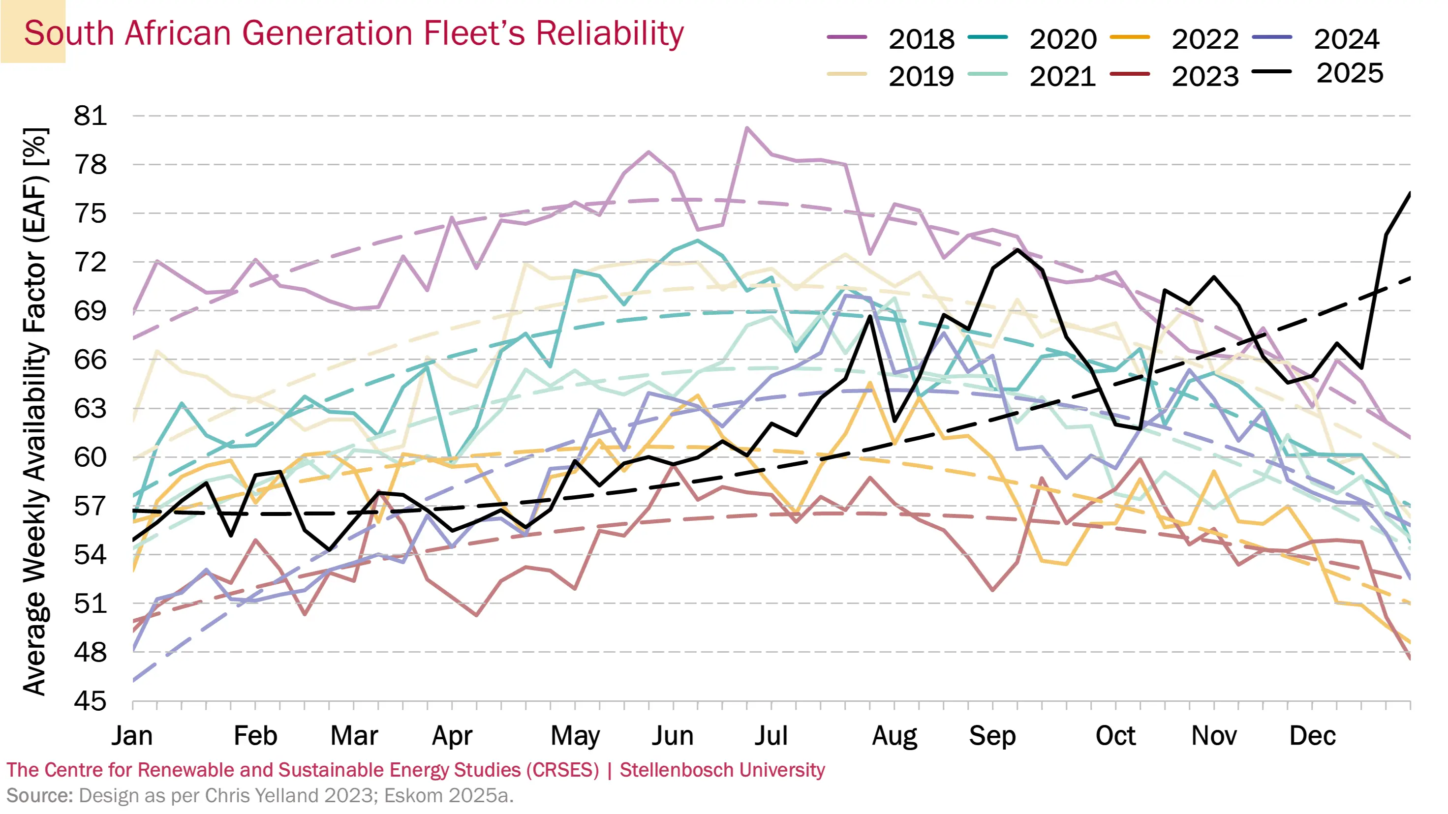 The reliability of South Africa's aging coal fleet declined drastically in recent years. Given coal's dominance in the energy mix, this impacted the reliability of the total South African generation fleet, as illustrated by the energy availability factor (EAF) graph below. EAF represents the amount of energy a generator was able to produce compared to its capacity over a period. As can be seen, EAF follows a seasonal trend informed by planned maintenance typically being scheduled during lower-demand summer periods, and more efficient coal plant operation during colder and dryer winter months. Noteworthy is how the EAF improved by July 2024, countering the declining trend of the preceding years and aiding in the reduction of load shedding.
