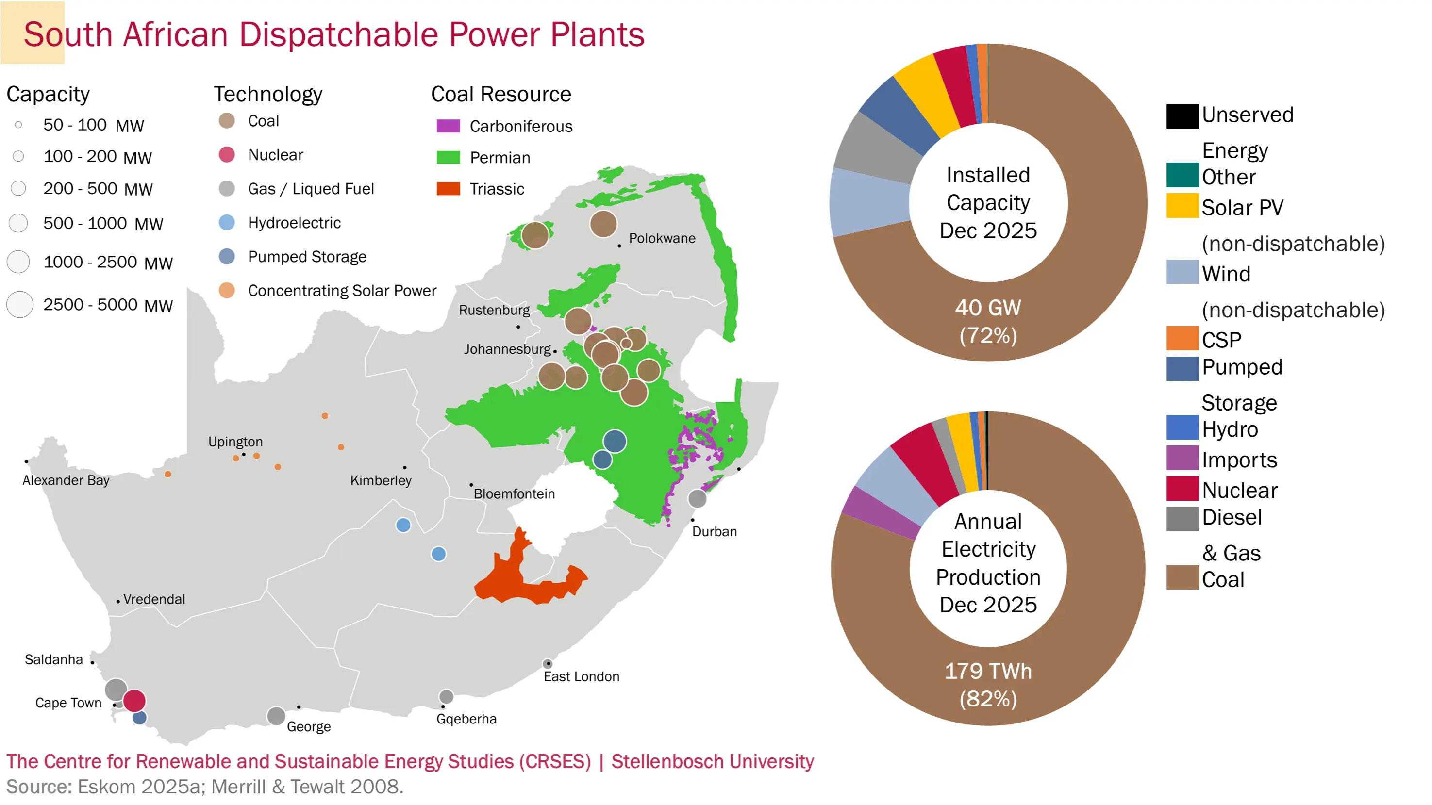 Dispatchable electricity generation in South Africa predominantly relies on coal, concentrated in the Mpumalanga region, which hosts the country's coalfields. South Africa's single nuclear power station is situated in the Western Cape near Cape Town, while pumped storage facilities are located in the mountainous regions of the Drakensberg and Kogelberg. As a water-constrained country, South Africa has limited hydroelectric resources. Additionally, the gas distribution infrastructure is underdeveloped, resulting in gas generation facilities being located primarily along the coast.